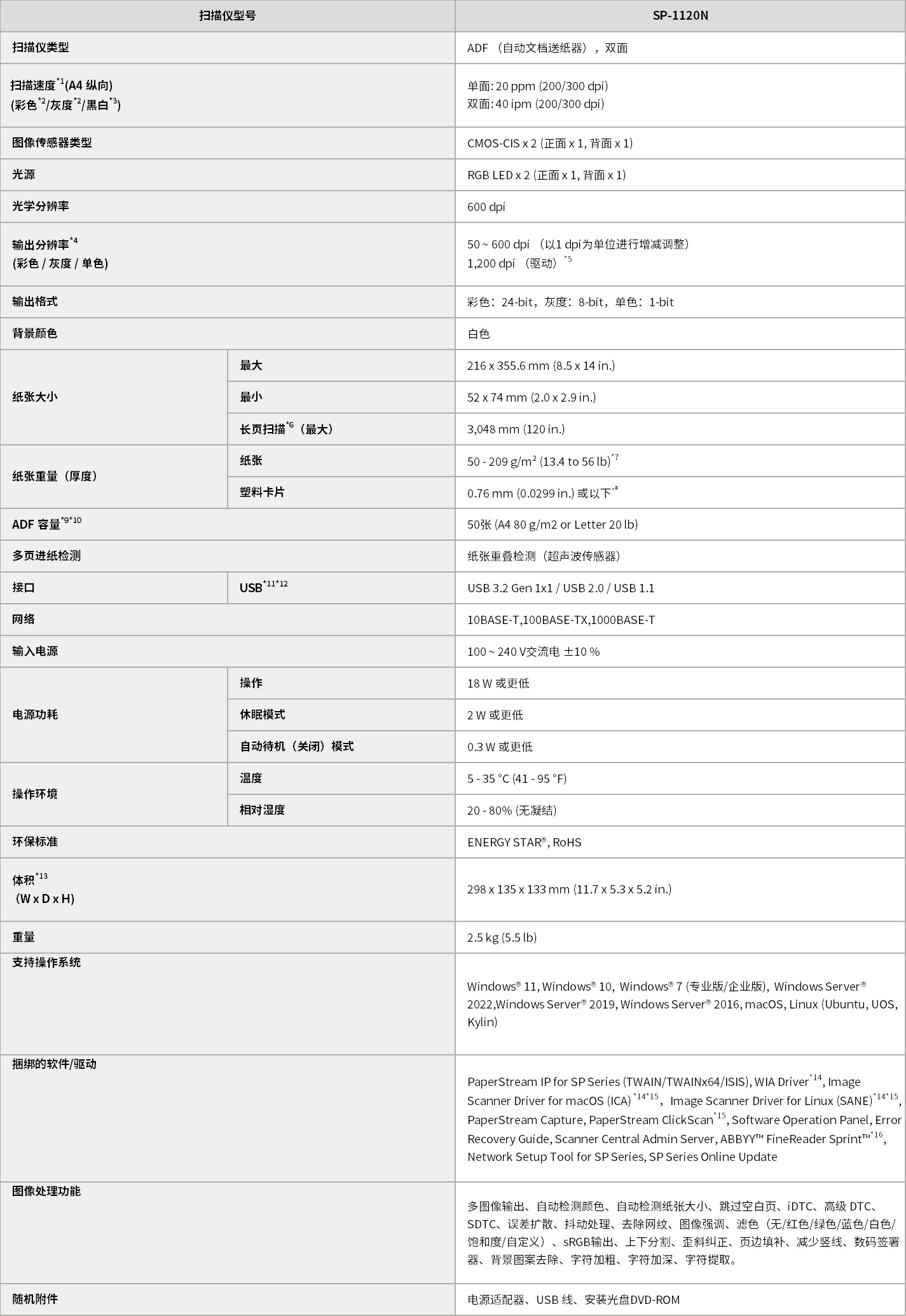 SP-1120N 扫描速度高达20 ppm/40 ipm (A4纵向, 彩色, 200 / 300 dpi),ADF进纸槽可容纳50张纸,支持多种文件混扫,是具有优秀性能的高性价比入门级机型。