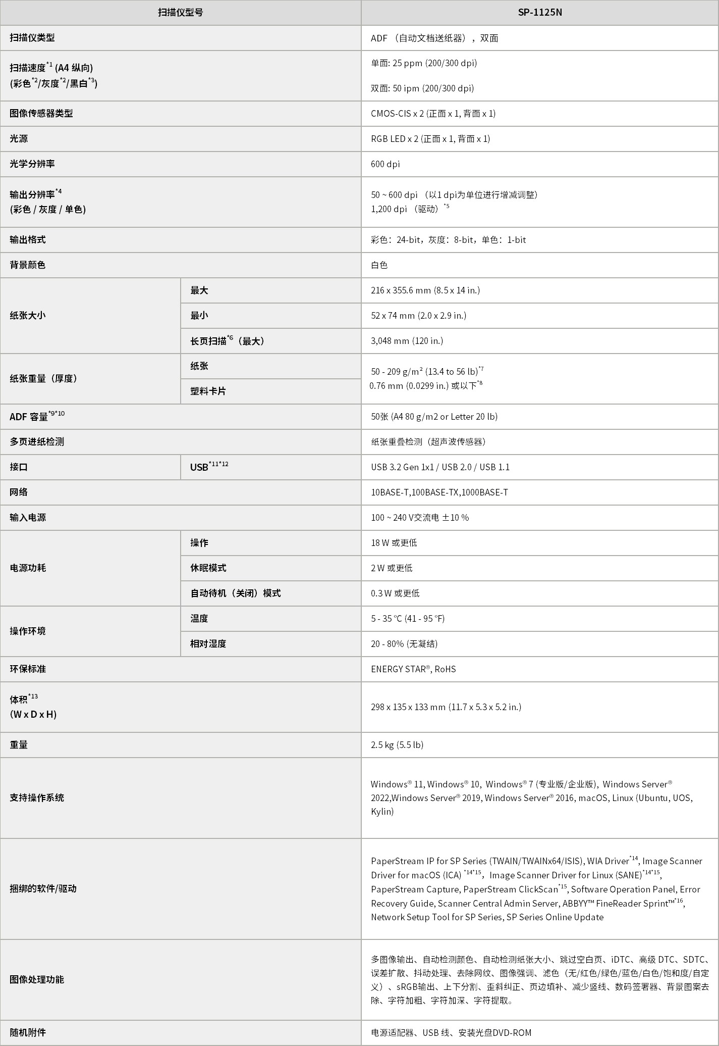 SP-1125N 扫描速度高达25 ppm/50 ipm (A4纵向, 彩色, 200 / 300 dpi),ADF进纸槽可容纳50张纸,支持多种文件混扫,是具有优秀性能的高性价比入门级机型。