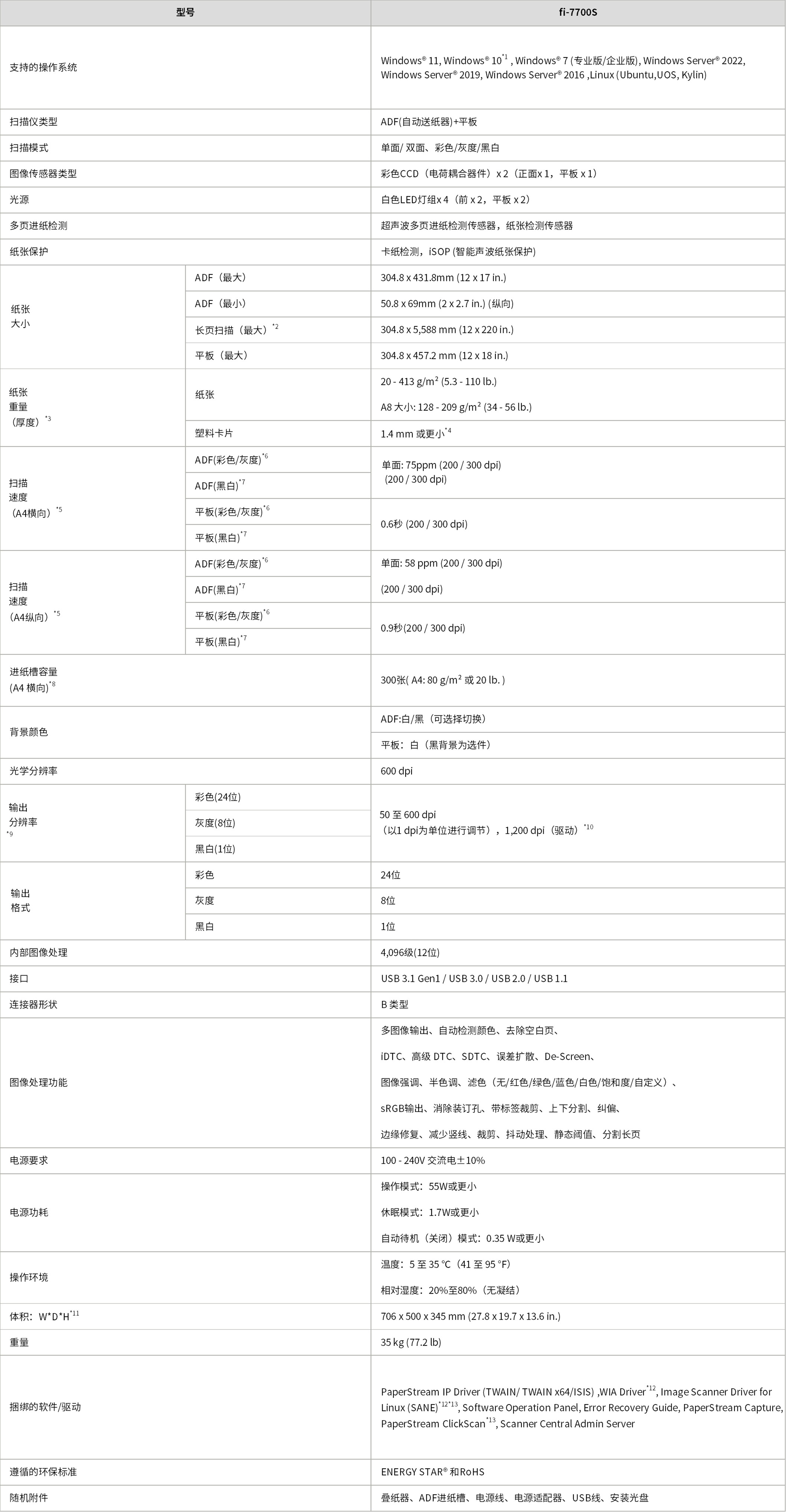 fi-7700S的扫描速度高达75ppm (A4,横向,200/300 dpi)。自动进纸槽一次性可容纳300张纸,有助于提高批量文件的扫描效率,方便连续扫描。此外,该扫描仪能扫描多种类型的介质,如薄纸、塑料卡片、书本、杂志、信封和长页文件等。