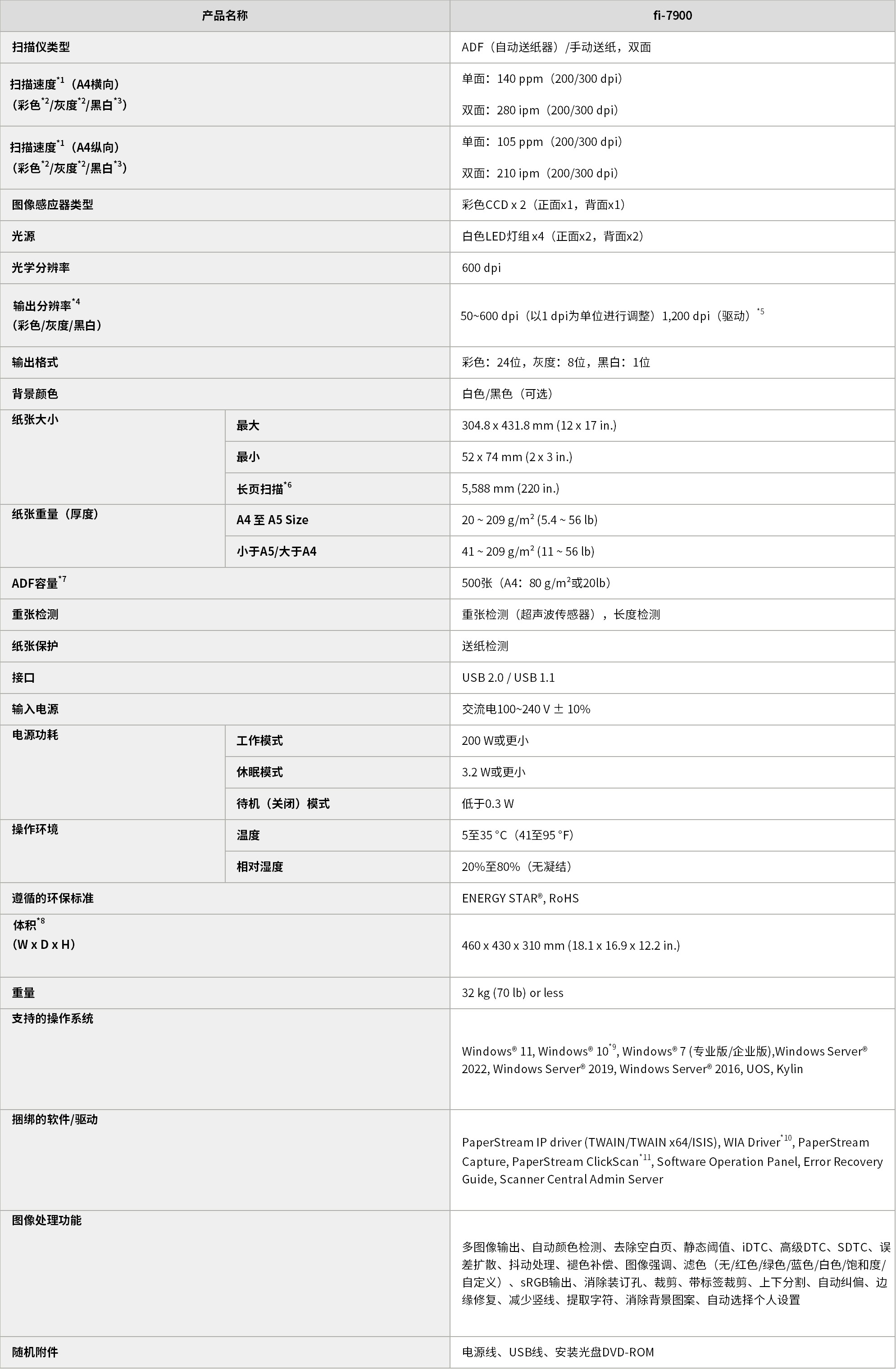 fi-7900的扫描速度高达140 ppm/280 ipm(A4,200/300 dpi),进纸槽容量为500张,日扫描量可达12万张,大大提高集中式扫描的工作效率。