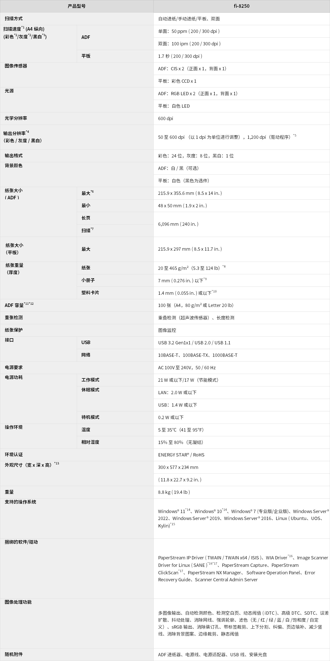fi-8250 提供非同凡响的全新扫描体验,并且拥有平板和 ADF 两种扫描方式。平板模式可进行 1.7 秒 / 张( 200 / 300 dpi ) 快速扫描,ADF 模式为 50 ppm / 100 ipm(200 / 300 dpi、彩色、A4、纵向)。ADF 一次可容纳多达 100 张纸。