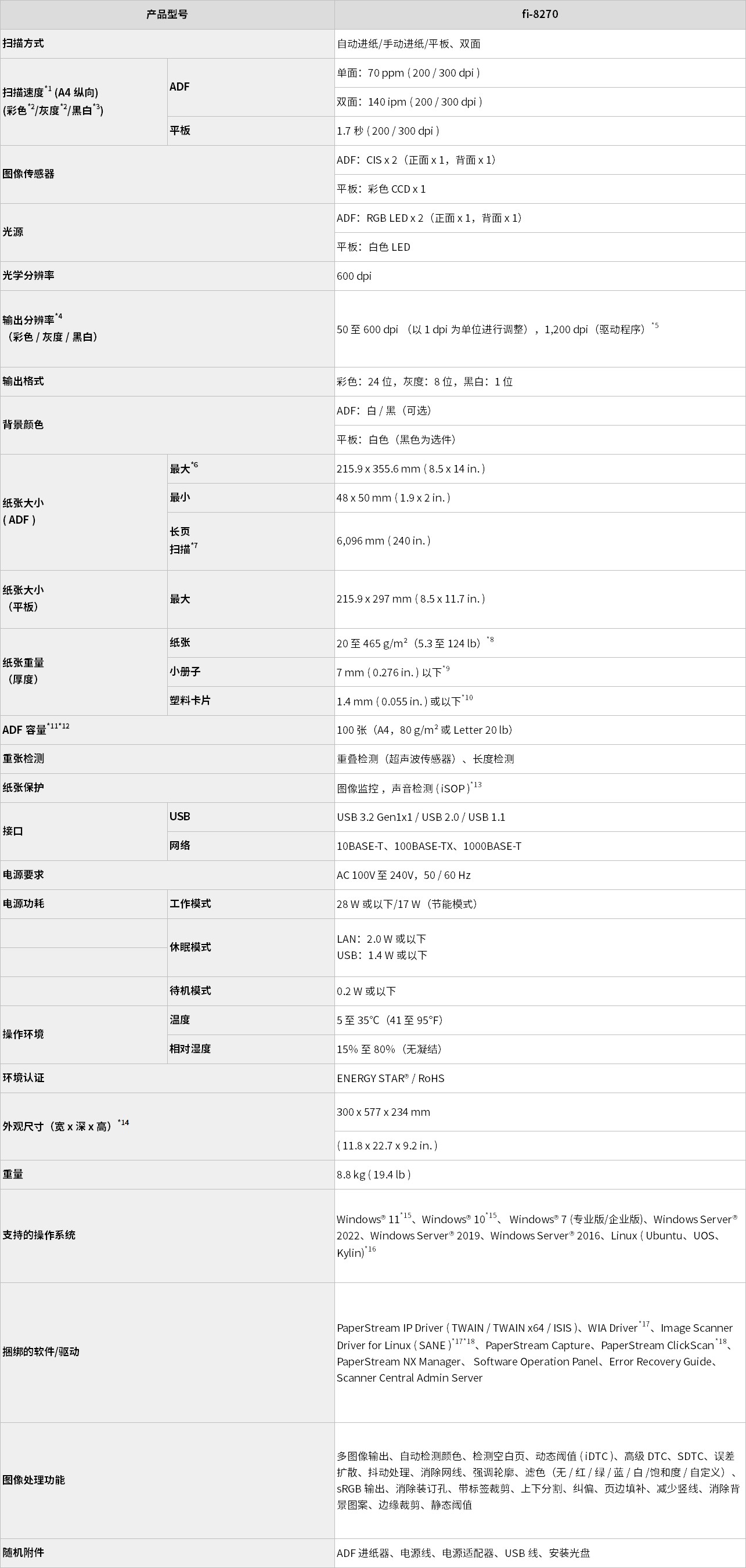 fi-8270 提供非同凡响的全新扫描体验,并且拥有平板和 ADF 两种扫描方式。平板模式可进行 1.7 秒 / 张 ( 200 / 300 dpi ) 快速扫描,ADF 模式为 70 ppm / 140 ipm(200 /300 dpi、彩色、A4、纵向)。ADF 一次可容纳多达 100 张纸。
