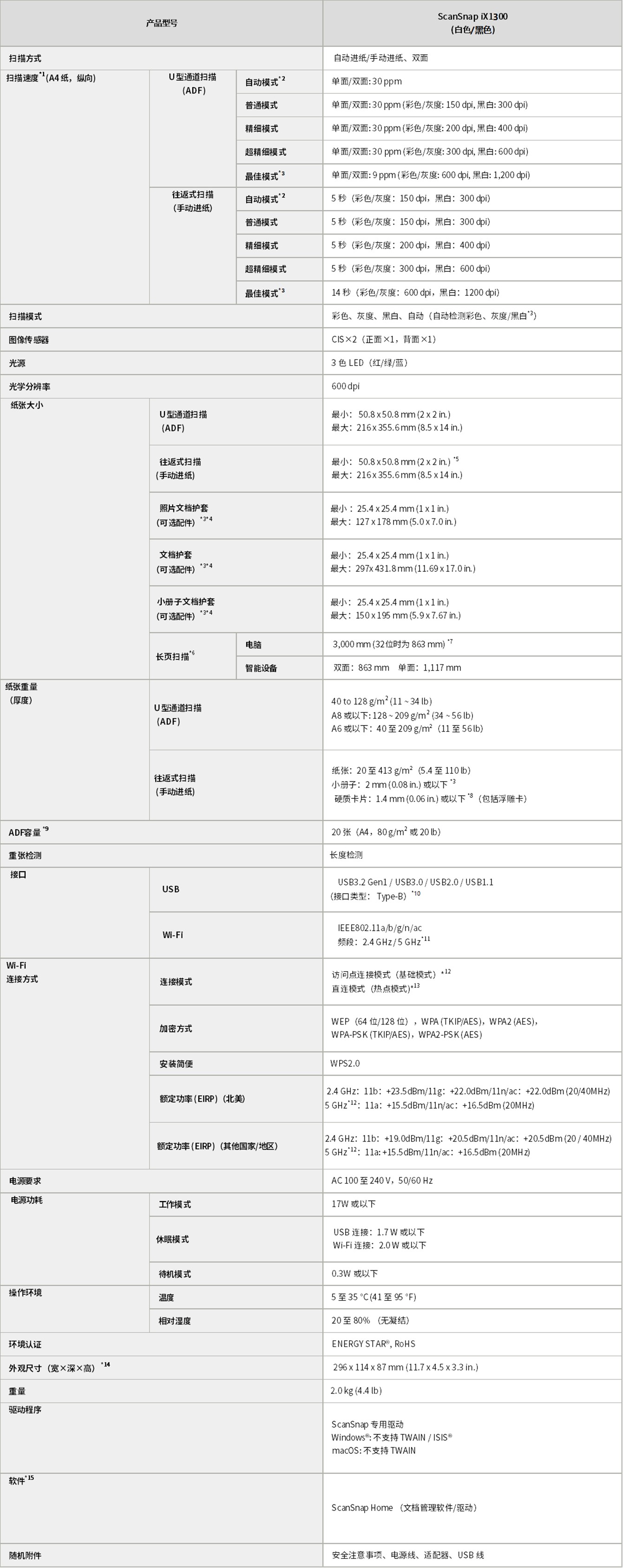 6.仅 在U 型通道扫描 (ADF) 时支持长页扫描(彩色/灰度:200 dpi,黑白:400 dpi)。使用 ScanSnap Connect Application时,以彩色/灰度:200 dpi ,黑白:400 dpi 扫描。