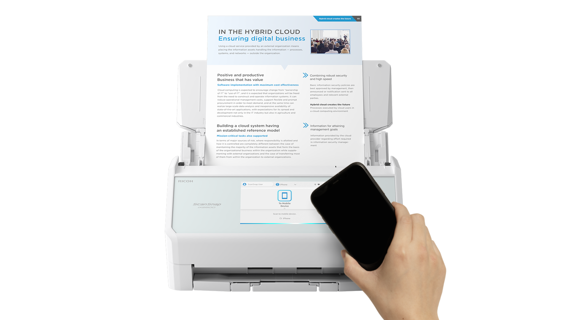 只需将智能手机靠近iX2500,即可立即将您的个人设置临时应用到扫描仪上。不仅能将文件保存到手机,提供便捷安全的短期共享使用体验,非常适合共享环境中的临时扫描需求。